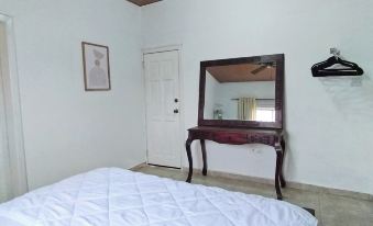Your bedroom is a cool retreat with air conditioning, a snug double-sized bed, a private bathroom, and a dress mirror doubling as a handy work desk.