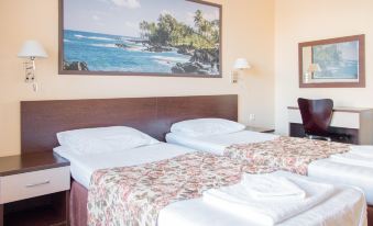Отличное место для отдыха с детьми, и просто для семейного отдыха. Отель небольшой, но очень уютный, находится вдоль дороги, но отгорожен большим плотным забором и поэтому шума практически не слышно, но до моря идти минут 20 и нужно перейти дорогу через надземный пешеходный переход или под мостом.На территории небольшой бассейн (всегда чистый), и своя столовая, которая работает весь день, и еда вполне вкусная,свежая, разнообразная, и не дорого) как в пионерском лагере) Рядом есть небольшой магазин продуктов,или Магнит, но до него идти минут 10-15. Отель из 2-х небольших корпусов, в одном из которых нет лифта, а этажей 5, нам сначала было непривычно и тяжеловато подниматься (ездили с бабушкой), но потом привыкли конечно же. Жили в номере на 4 человека, матрасы, подушки и постельное белье очень хорошие, чисто-белые. Для ребенка и бабушки были раскладушки, но очень классные, широкие и устойчивые с отличными матрасами! Большой балкон с стульями и столиком. Около бассейна есть зона с мангалом-камином для шашлыка ,там большой стол и лавка, вечерами там удобно посидеть, а дети рядом купаются.