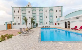 Family room on top floor with was big and clean and quiet. Had balcony with great views to sea and mountains. Hotel has big clean pool as bonus. Staff friendly and helpful. Can help organise meal delivery from cheap but good town restaurant. Also can arrange local guide to take you on 2.5 hour dolphin, turtle boat view trip that includes snorkel stop on coral and fish. From bitumen town road the hotel visible halfway down on the right hand side as tall building with white sign on roof at easy to reach in 2 WD car driving on the old runway