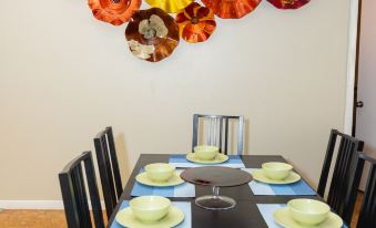 Apartment #2 Living room is large, with comfortable seating, smart TV, books and board games, and a large closet. Dining area features a table that seats 6.