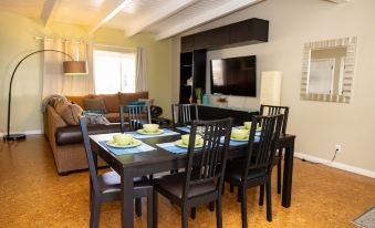Apartment #1 has three king-bed bedrooms, 2 full baths, spacious kitchen, and comfortable living room. Front door opens to large open living room, dining area, and spacious kitchen with bar. Two large entry closets. The living room has a smart TV, books and board games, and plenty of comfortable seating. Dining area features a table that seats 6, plus additional seating at the bar.