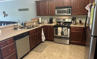 3 bedrooms: 2 bunk beds 1 queen bed and 1 king bed
