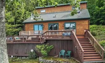 stone fireplace, 3 bedrooms, 2 bathroom + W/D. One large bedrooms is on the 1st floor, a second on the 2nd floor accompanied by an open bonus sleeping area that can accommodate a crowd. Multi Level deck, fire pit & boat dock for two boats complete this island oasis.