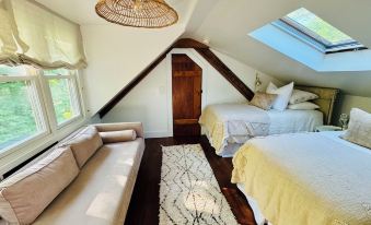 Our farmhouse has 4 bedrooms, including 2 kings, 1 queen, 2 twins, a daybed, a cot and a sofa bed. A gorgeous back yard, complete with a pond with fish, stone fence and river viewing. Absolutely perfect for groups or multiple families!About pets:Pets allowed: dogs less than 50 lbs per pet (limit one pet total).About checkOut:Check out before 11:00 AM.About children:Children allowed: ages 0-17.About checkIn:Check in after 4:00 PM.About smoking:Smoking is not permitted.About minBookingAge:Minimum age to rent: 25.About events:No events allowed.