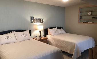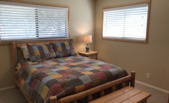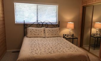 On the lower level, you will find a huge private suite with a gas-burning adobe-style fireplace, full living area, two queen beds and a full newly remodeled bathroom, including a new walk- in tile shower, vanity and tile floors.