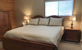 Also on the main floor, you will find two charming bedrooms with pine walls that contribute to the cozy, cabin feel throughout the house. Both rooms have queen beds, plenty of storage and a full bathroom across the hall. The master bedroom at the end of the hallway, boasts a king-size bed and a full master bathroom.