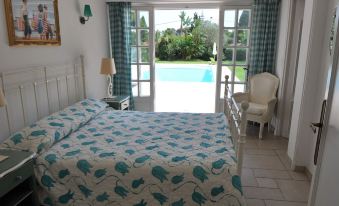 There are two double bedrooms on the ground floor off the living room. The first has a dressing room and a bathroom with bath and WC. There are doors to the terrace and a view on the swimming pool, table and chairs.