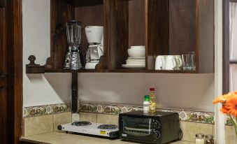 Decorated in colonial style with local textiles and traditional art, Loft El Chiquito’s second-floor bedroom features a queen bed, desk, and reading nook, as well as a TV with cable and strong wifi. Downstairs, you’ll find a fully furnished kitchenette and a breakfast bar with seating for two. The full bathroom, also located on the ground floor, offers hot water and a stand-in shower.