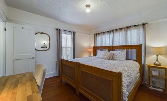 The secondary suite is just off of the main bathroom, and is made up of a queen size bed and another large closet space. Both rooms have portable heaters to ensure a comfortable heating experience for each guest's taste, as well as white noise machines for added comfort.