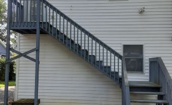 This apartment is on the second floor, and there is a flight of exterior stairs leading up to the front door.