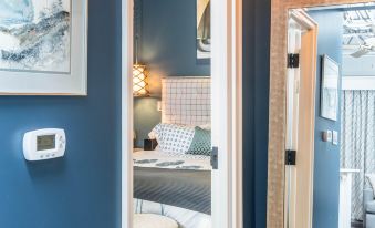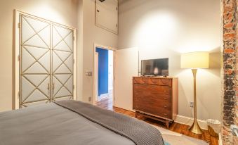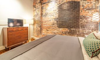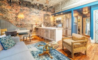 Embrace the unique charm of this boutique space in an iconic red brick property. The loft-inspired private apartment features exposed original walls, dark surfaces, contrasting textures and patterns, an array of unique furnishings, and curated artwork throughout.