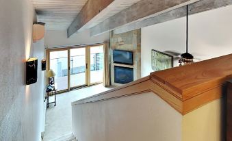 High ceiling in a family settings. Sliding door to balcony. Kitchenette with cookware. Highly recommended.