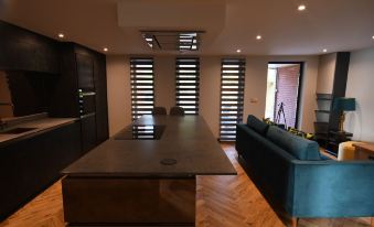Stylish and spacious open plan living, comprising of a large contemporary fully integrated kitchen with a dishwasher and a large island providing seating for up to 6 people. Beautiful concrete quartz worktops, copper sink and tap, solid oak flooring throughout and a 55 inch LG smart TV with comfortable sofas and pouffes in the living area.