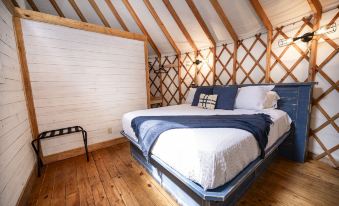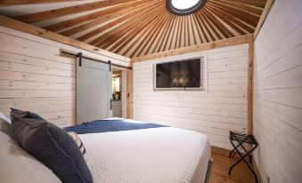 "Mourning Dove" is cozy and features high ceilings showcasing the beautiful wood and natural light from the Yurt design. It has an open-concept living space featuring a large and super comfortable Queen Sleeper Sofa and TV (Streaming with own account only- No Cable). Our Yurts have been designed to offer the amenities of the modern world (Wifi, Bathroom, Comfortable Beds, large Kitchenette, A/C & Heat) while still providing a simplistic connection to nature.