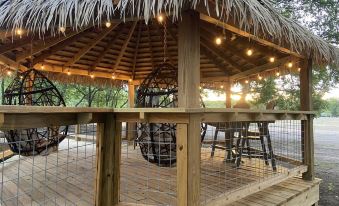 Fire up the Argentine Gaucho Grill in the outdoor sitting area and sizzle up a delectable feast as the tantalizing aroma fills the air. Share stories and laughter with loved ones as you gather around under the starry Texas sky. Nestled underneath a large array of Oak, Pecan, Cypress, Mulberry and Cedar Trees, it creates the most perfect and peaceful setting for your weekend getaway.