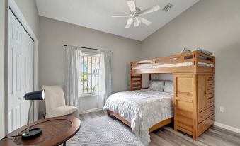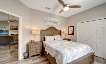 All on one floor, this home is perfect for older folks and toddlers! Enjoy the huge covered back porch with comfortable seating for the whole family. Stairs down will take you to the screened pool with another private and shaded deck to watch the children splash in the spacious, saltwater pool (optional heating $25/day).
