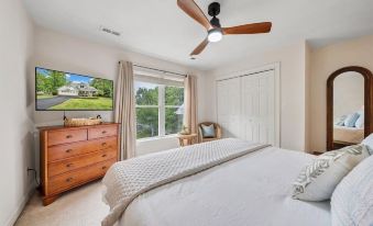 The second floor has two ample-sized bedrooms and a full bathroom with shower and tub. One bedroom has a beautiful new queen size canopy bed with pillow top mattress, dresser and smart TV. The second bedroom has incredible views of the lake, new king size bed and pillow top mattress, dresser and smart TV. All beds in the home have crisp white, fluffy duvets with additional quilts providing our guests with the dreamiest night's sleep after a full day of playing on the lake!
