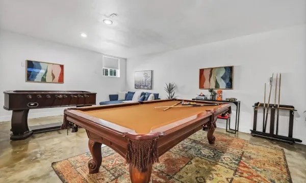 The home is newly renovated and redecorated with desert scapes keeping in mind. The space is bright and inviting with a feeling of relaxation. You can do yoga (mats are provided) on one of the balconies or in the front yard or at the same time have some fun playing sports with balls, rackets and all that you would need provided. The gameroom is completed with bar fridge, board games, pool table and foosball table, the couch is a pullout queen sofa bed where you can stretch out and unwind while watching a movie or sports (smart tv, Netflix, Apple TV and cable). It is located on it's own level with 2 bathrooms where parents can have kids enjoy themselves without worrying of them escaping anywhere as there is only one way to get into the game room, to get outside they will have to come up the stairs into main living areas where adults can relax or have a gathering themselves. It is also a great home for groups, with 3 levels of the home. Those wanting some privacy and quiet could choose the upstairs level, which locks from the main areas, where next 4 bedrooms are located and downstairs game room floor have a door and then, game room itself. So it can be quite an insulation, if people want to gather and stay up, while others want to catch up on their rent perhaps for morning golf or other morning activities or even do some work.