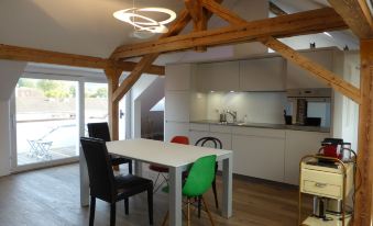 Private elevator access directly into the apartment on the fifth Floor. Large open living room with modern kitchen, dining table, sofa corner and roof balcony. View over the rooftops of Bern at the Gurten and the Alps.