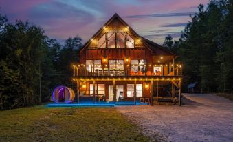 Escape to this brand-new mountain chalet, where luxury meets nature! Enjoy breathtaking pano views & cozy fireplace. Unwind in the hot tub and barrel sauna while the kids enjoy the playground. Roast s'mores by the firepit. Compete in the epic game room, featuring a pool table, ping pong, air hockey & arcade games! With 5 themed bedrooms, 7 smart TVs, a chef kitchen, coffee & popcorn stations, BBQ grill, cornhole, frisbee golf, yoga, a boot dryer & a backup generator, your ideal vacation awaits!