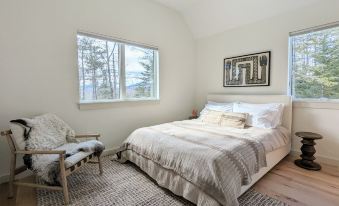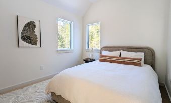 This modern chalet-style cabin features high ceilings, expansive windows, and elegant materials and furnishings. The home comfortably accommodates up to 10 people, with three bedrooms and an additional sleeping area on the lower level, making it perfect for families or groups of friends. The 3.5 bathrooms feature spa-worthy tiling and a dreamy bathtub in the primary bath. The fully equipped stylish kitchen, sun-soaked dining area and living room, half bath and laundry room, expansive deck and primary suite make up the open first floor plan. Upstairs you’ll find two queen bedrooms and a full bath. On the lower level is another full bath, yoga/gym room, wet bar with wine fridge, theater room, and additional sleeping area.