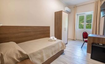 Unica,struttura a due passi dalle terme. Hotel con camere nuove, moderne e bagno exstralarge con kit cortesia da quattro stelle. Pulizia eccezionale e cambio giornaliero delle asciugamani. Ho usufruito della mezza pensione: cibo ottimo e abbondante , ingredientifreschissimi e io che cucino ho constatato che la qualità dei prodotti è eccellente e credo a chilometro zero. Le verdure e i pomodori saporitissimi, sembravano appena raccolti dall orto di casa. E il menu alla carte vario e con prezzi molto accessibili. Il personale disponibile, gentile e pronto a soddisfare qualsiasi tua esigenza . Ho alloggiato in altre strutture alberghiere termali da Ischia alla Sicilia passando per Guardia Piemontese vicino Cosenza ma,questa decisamente la migliore Piu che Ottimo rapporto qualità -prezzo.
