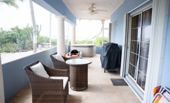 A very private end unit condo right on the Caribbean Sea (3 Bedroom 2.5 Baths). Spectacular views right from your Kitchen and Living Room. There are 2 large screened in porches and a mobile BBQ Grille to cookout and a private peninsula right on the ocean for morning coffee or evening drinks in the soft breezes. Paddle board and kayaks included that can be launched from your doorstep to snorkel, scuba dive and explore the corals reefs right off the shore. Laundry room also included inside the unit. Additionally you have access to a shared pool, tennis and pickle ball courts on the property.