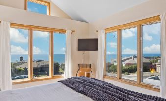 Inside, the main living area features plush seating, a cozy fireplace, and expansive windows that fill the room with natural light and panoramic ocean views. Whether you're curled up with a book, sharing stories by the fire, or watching a Pacific sunset, this space encourages total relaxation.