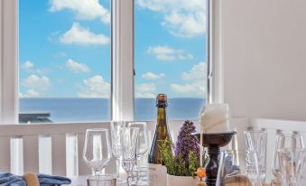 The modern kitchen—with butcher block counters, beachy blue-and-white cabinetry, is both functional and charming. Cook a seaside feast or enjoy casual breakfasts with ocean breezes drifting through the windows.