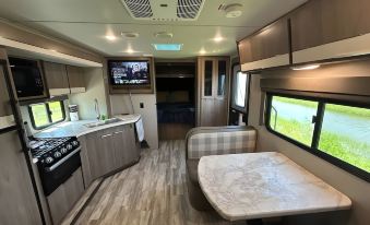 This RV sleeps up to 6 guests and features a private queen master bedroom for quiet rest, along with two queen bunk beds that are perfect for kids or additional guests. A Smart TV in the living area offers a great spot to relax and wind down after a day full of sunshine and salt air.