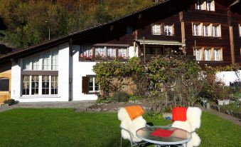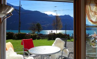 Brienz: Beautiful, cosy, comfortable chalet "Am Brienzersee", from the 18th century, renovated. In the centre of Brienz, in a central, quiet, sunny position, 30 m from the lake. Private: well-kept garden with lawn and flowers, lawn for sunbathing. In the house: central heating system, washing machine (for shared use, extra), drying room. Linen change weekly (suppl. charge extra). 20 m long narrow motor access to the house. Parking at the house. Shop, grocery, supermarket 500 m, restaurant 300 m, bus stop "Brienz, Bahnhof" 350 m, railway station "Brienz" 350 m, public bathing area 500 m, lake Brienzersee Promenade 40 m. Golf course (18 hole) 25 km, riding stable 4 km, walking paths from the house 20 m, mountain railway 300 m, skisport facilities 12 km. Nearby attractions: Freilichtmuseum Ballenberg, Brienzer Rothorn, Aareschlucht. Well-known ski regions can easily be reached: Meiringen - Hasliberg, Axalp. Well-known lakes can easily be reached: Brienzersee. Hiking paths: Brienzer Rothorn, Axalp, Rosenlaui. Please note: ski bus (free of charge). Free ski bus service to the ski region Axalp. Please note: the owner lives in the same residence. Railway line closeby. "Am Brienzersee", 2-room apartment 54 m2, on the ground floor. Spacious and bright, comfortable and tasteful furnishings: open living/dining room 20 m2 with 1 double sofabed (1 x 160 cm, length 200 cm), cable TV, radio and CD-player. Exit to the patio. 1 open room with 1 double bed (2 x 90 cm, length 200 cm), 1 pull-out bed, TV and flat screen. Open kitchen (oven, dishwasher, 4 ceramic glass hob hotplates, toaster, kettle, microwave, electric coffee machine, Capsules for coffee machine (Nespresso) extra, raclette grill, fondue Set (cheese)) with dining table. Shower/WC. Natural stone floors. Patio 15 m2, south facing position and west facing position, garden, lawn 40 m2. Terrace furniture, deck chairs (2). Marvellous panoramic view of the lake and the mountains. Facilities: iron, baby cot for up to 2 year olds, hair dryer. Internet (WiFi, free). Parking. Please note: non-smokers only. Maximum 1 pet/ dog allowed. Fire extinguisher.