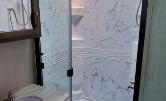 Secluded and private 6 acres on Keller Bay surrounded by saltwater lakes. 40ft Forrest River Sandpiper Destination RV with memory queen foam bed, two queen sofa beds and a 4 person table. Sleeps 6. Lots of extra camping space for 16 guests in tents and/or garage area.