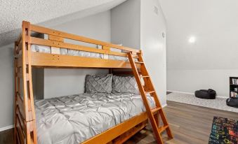 - Bunk beds with a pull out trundle upstairs sleeping three (one full, two twins)