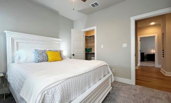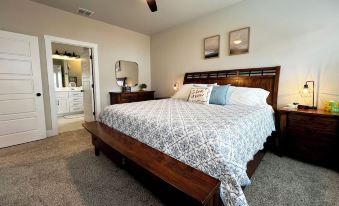 Indulge in comfort and style in our spacious primary suite, featuring a plush king-size mattress for restful sleep. This elegant retreat boasts a private en-suite bathroom with modern fixtures, double sinks and a large walk-in shower. Getting ready in the morning or unwinding at night is a breeze with the large attached walk-in closet that offers two luggage racks, iron/ironing board, wooden hangers and ample storage for your belongings.