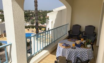 From the lounge, you have immediate access to a good size balcony with table and chairs plus sun loungers and views over the pools and town below.