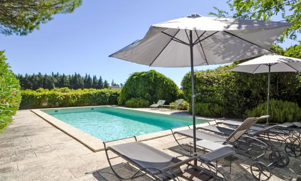 Beautiful mas "Les Puits Neufs", from the 19th century. 5 km from the centre of Cavaillon, 6 km from the centre of L'Isle-sur-la-Sorgue, 25 km from the centre of Avignon, in the countryside. Private: property 2'400 m2 (fenced), garden with trees, meadow, swimming pool fenced (10 x 5 m, depth 150 cm, seasonal availability: 01.May. - 30.Sep.). Terrace. Motor access (300 m via unmade road). Parking at the house. Supermarket 5 km, bus stop "Les Jonquiers" 3.1 km. "Les Puits Neufs", 6-room cottage 200 m2 on 2 levels. Spacious, tasteful and cosy furnishings: living room with open-hearth fireplace (only for decoration), TV, radio and DVD. Exit to the terrace. Walk-through room with 1 french bed (1 x 140 cm, length 190 cm), bath/shower/WC and double hand-basin. 1 room with 2 beds (90 cm, length 190 cm). Exit to the terrace. Dining room with open-hearth fireplace (only for decoration), dining table. Open kitchen (oven, dishwasher, 4 gas rings, toaster, kettle, microwave, freezer, electric coffee machine) with dining table. Exit to the terrace. Upper floor: 1 room with 2 beds (80 cm, length 190 cm), bath/WC and double hand-basin. 1 room with 1 french bed (1 x 160 cm, length 200 cm). Shower/WC. Electric heating. Natural stone floors. Terrace 160 m2 partly roofed. Terrace furniture, barbecue (portable), deck chairs (4). Facilities: washing machine, iron, baby cot. Please note: maximum 1 pet/ dog allowed. Smoke alarm, fire extinguisher.