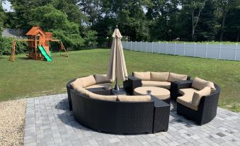 Patio with beautiful wicker furniture and Playground full swing set with slide for the kids!