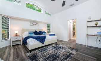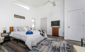 The master suite has a new king size mattress for your relaxation With new linens and pillows. The private master bath features a large walk in shower huge jetted soaker tub and ample closet space. The master has a his and hers walk in closets, and 55 inch smart TV.