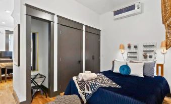 Inside, the Indigo Flat comfortably hosts three guests. The bedroom features a cozy queen bed, perfect for a restful night's sleep. We've updated our living room with comfortable chairs instead of a sofa, and the third guest can sleep on a comfortable air mattress. The highlight is our fully equipped kitchen, featuring modern appliances like a stainless steel refrigerator, oven, microwave, and dishwasher. You'll find all the essentials, including a coffee maker, toaster, and a variety of pots, pans, and utensils—perfect for whipping up a quick breakfast or a gourmet dinner.