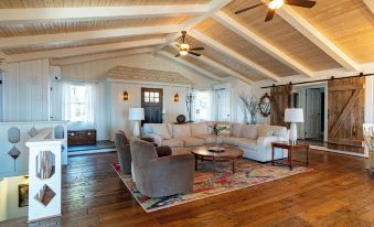 The downstairs features three bedrooms and one full bath. Two bedrooms, each with twin beds and another bedroom with a queen bed share a bathroom. The downstairs also includes a large game room where you can play pool, foosball and enjoy a 65-inch TV and fireplace. Located outside two of the bedrooms and for your convenience is a small beverage refrigerator The sunroom includes another 65-inch TV and is the perfect place to relax, play games and read while enjoying the view.
