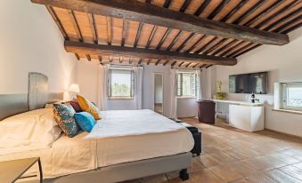 La camera è spaziona, struttura complessivamente ben tenuta e di recente ristrutturazione. Nel minibar in camera, a disposizione degli ospini, una bottiglia da litro di acqua gasata e una di liscia ( gratuita). Le finestre isolano bene dai rumori esterni anche sa la zona è molto tranquilla. Buona la pulizia e il bagno era ampo e rassettato tutti i giorni. La colazione, sia dolce che salata, va ordinata la sera precedente compilando una lista, si troverà il tutto sul proprio tavolo il giorno dopo. A tale proposito, consiglio al titolare di coprire le pietanze che posizionate sui tavoli in attesa degli ospiti, potrebbero essere preda di insetti. La caffetteria è su richiesta e viene preparata al momento con macchina professionale. La struttura è dotata di una piscina a disposizione degli ospiti. Bellissimo il tramonto, con il sole che scende dietro Città della Pieve. Dedicategli 5 minuti del vostro tempo, ne vale la pena. Complessivamente una struttura ottima, la cosiglio.