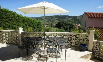 Four bedroom modern villa in Collioure with heated swimming pool (heated if necessary 3rd May - 26th September 2025) - about a 15 minute walk to the centre of the town, beaches, numerous restaurants and bars. 10 minute walk to a casino. Excellent views towards the hills, vineyards and Fort St Elme from the terraces. It is beautifully furnished and has three different outdoor dining areas. 2 x double bedrooms, 1 x twin/king size double and 1 x twin room. Hair dryer in each bedroom. Very well equipped kitchen - electric oven and induction hob, full size dishwasher, microwave, large fridge/freezer, kettle, Nespresso capsule coffee machine, filter coffee maker, juicer, toaster and oyster knife! High chair and travel cot available. Spacious lounge/dining area with full length windows opening onto the front balcony and rear terraces with panoramic views. Dining table seats 8 people comfortably as does the wooden table outside on the terrace and the table on the front balcony. Starlink WiFi, Netflix, UK Internet TV, DVD, Bluetooth player. Table tennis table on rear patio and pool table in basement. Very pretty terraced garden with lockable gate to swimming pool for child safety. Washing machine in basement. Electric heating in all rooms.