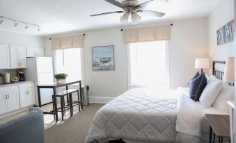 Modern meets quaint in this updated downtown studio. Enjoy second story living with street views and full amenities for a comfortable “home away from home” stay! Steps away from Fireman’s Beach, Icehouse Park, Silver Shores, Vacavi coffee shop, Lakeside Diner, gift/clothing shops and more. Located above a boutique clothing store and dog grooming service and across the street from Rising River Brewing.  Relax in comfort with a well applianced kitchen, sitting area, king bed, and central air. Located 15 minutes from Meadville.