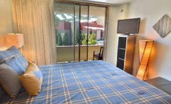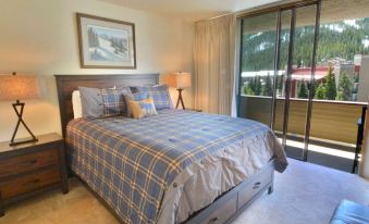 Enjoy the outdoor balcony and take in the stunning mountain and village views in this 1100 sq. ft. 2-bedroom, 2-bath residence that sleeps 8. The master bedroom is furnished with a queen-size bed, Smart TV, a large double-sink vanity, and a full-size bathroom. The second bedroom includes two bunk beds: one with a double and a twin, the other with two twins.