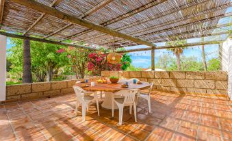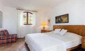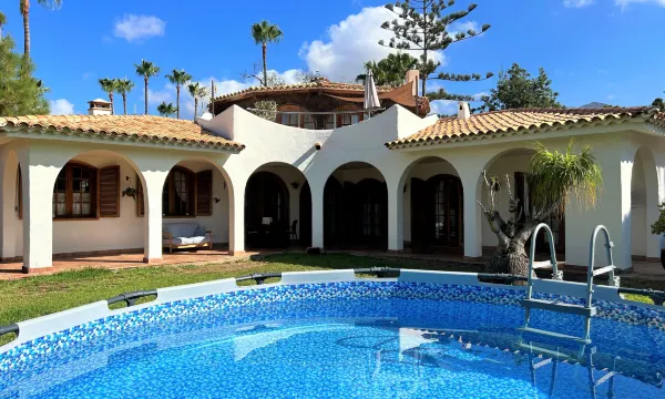 Large, comfortable farm estate "Finca Ingala", 2 storeys, surrounded by trees. In the centre of Costa Adeje, residential area (villas), excellent location: right in the centre but still quiet, 1.3 km from the sea, 1.3 km from the beach. Private: garden 2'500 m2 flowers and trees, swimming pool round (3,6 m diameter, depth 90 - 90 cm, seasonal availability: 01.Jan. - 31.Dec.). Outdoor shower, patio, terrace, garden furniture. In the house: with TV, WiFi, storage room for bicycles, sun terrace, roof terrace, laundry, washing machine. Storeroom available. Parking (for 2 cars) at the house. Supermarket, shopping centre 500 m, restaurant, bar, pub garden 280 m, bus stop "El Duque" 500 m, sandy beach "Playa del Duque, Playa Fañabé" 1.3 km, shingle beach "Playa de la Enramada" 2.5 km, park "Jardines del Duque" 10 m, diving center 3.5 km, thermal baths "Vitanova Spa" 900 m. Sports harbour 3.5 km, marina 3.5 km, sports centre 500 m, children's playground 10 m. Nearby attractions: CC Plaza del Duque 1 km, Fañabé street market 650 m, Aeropuerto Reina Sofia 18.7 km, Golf Costa Adeje 5.2 km, Puerto Colón 3.5 km, Siam Park 4.3 km. Hiking paths: Barranaco del Infierno 5.4 km. Please note: suitable for families. Groups of teenagers on request only. Neighbourhood highly sensitive to noise. Quietness and good behaviour expected. 3-room villa 159 m2 on 2 levels, on the ground floor. Object suitable for 5 adults. Spacious, comfortable and wooden furniture furnishings: large living/dining room with 1 double sofabed (140 cm, length 200 cm), open-hearth fireplace (only for decoration), library, satellite TV and fan. Exit to the garden. 1 large room with 1 double bed (200 cm, length 210 cm), fan. Interconnecting room with Dressing room. Kitchen (oven, 4 ceramic glass hob hotplates, toaster, kettle, microwave, freezer, electric coffee machine). Shower/bidet/WC, sep. WC, double hand-basin. No heating option. Upper floor: (exterior staircase) large, 1 room 51 m2 with 2 beds (90 cm, length 200 cm), kitchen corner. Exit to the terrace. Shower/WC. Natural stone floors. Terrace furniture, covered balcony, sitting area. View of the garden and the countryside. Facilities: washing machine, iron, children's high chair, baby cot for up to 2 year olds, hair dryer. Internet (WiFi). Parking (fenced 2 cars). Please note: non-smokers only, non-smoking house. No internal connecting door between the floors. VV-38-4-0091234 ESFCTU0000380150009041140000000000000VV-38-4-00912345
