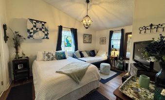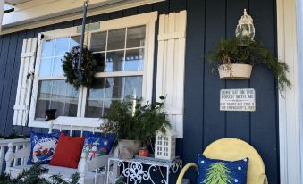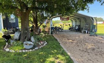On the outside of the rental there is a beautiful side yard and courtyard. We incorporated some whimsical colorful art so you will see some pretty cool things out there. For the kids, we have a paper scavenger hunt to find all the "critters” throughout the gardens and a fairy garden under the large oak tree for the kids to enjoy. For the adults the courtyard has a grilling area with a propane gas grill, picnic table, wood fire pit, chairs around the firepit, covered carport/dining area with another large dining area and outdoor bar. The café lights in this area really enhances it at night. It is absolutely beautiful out there under the stars.