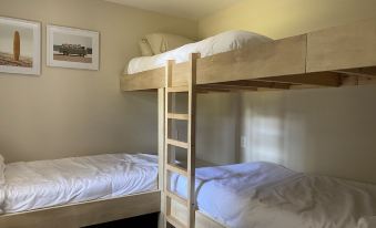 The cottage features two bedrooms and one bathroom, providing a comfortable retreat for families or groups of friends. The primary bedroom offers a queen-sized bed, while the second bedroom has custom-made bunk beds with three twin mattresses. There is also a pull-out sofa bed in the living room.