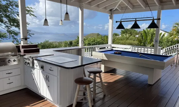 Coconuts is among only a few St. John villas that offer two kitchens; a fully enclosed main kitchen with a breakfast bar for entertaining the chef, and a complete outdoor kitchen facing the view in the billiard porch. The outdoor kitchen includes a built-in 36 inch gas grill, Teppanyaki cook surface, dual side burners, hot water sink, fridge, illuminated bar, and granite counter dining for six.