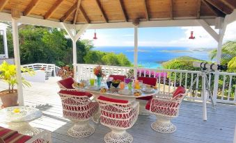 Dining options are extensive, and include the great room table for six, the gazebo dining table for six, and granite counter dining for six by the outdoor kitchen. Dine in the gazebo, at a table with some of the finest ocean and sunset views on St. John.