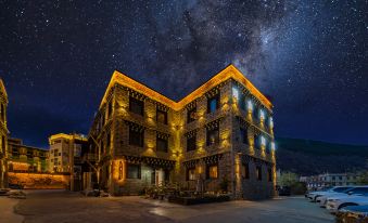 Its design blends local ethnic cultural elements with modern comfort: log-built main buildings, bright traditional-style painted doors/windows, and courtyard tapestries with auspicious patterns. Mani stones, gesang flowers, and highland barley create a strong regional atmosphere. Guest rooms are spacious, with solid wood floors and thick blackout curtains to fight plateau night cold. High-count cotton bedding and cashmere blankets ensure sound sleep. Some rooms have exclusive terraces with rattan furniture and vintage heaters—perfect for daytime meadow views or night stargazing.